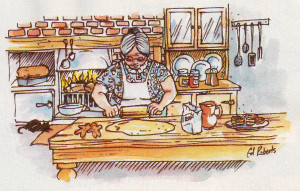 Her Saturday bread-making sessions were renowned as flour, salt and yeast would be deposited into a monstrous brown panmug and kneaded by hand into a seething mass of sticky dough. When ready, this would then be deposited onto a floured board on the well-scrubbed kitchen table and rekneaded for what seemed an age, accompanied by much puffing and panting. The mixture would then be left standing on a large brass stool before the open fire in the living room to rise.
