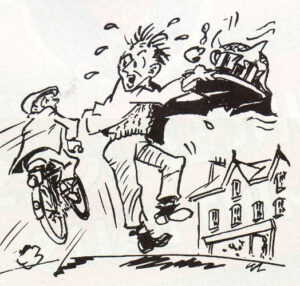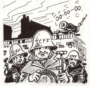 In 1941, as a consequence of German air raids, the National Fire Service was formed along with a system of civilian fire-watchers. The latter activity was compulsory for every male over the age of 16 who wasn’t a member of any other national service organisation, so I found myself enrolled in the ‘Town Centre Fire-Fighting Association’. Our command post was an empty shop near the printing works, manned during the day by a full-time warden plus six part-timers at night. Duty shift ran from 6pm to 6am and if the sirens sounded we had to patrol the streets wearing our ‘TCFA’ armbands and ridiculous-looking bucket helmets and carrying stirrup pumps.