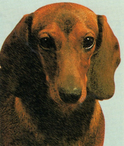 She was a rather roly little creature all round really. Dachshunds at their finest are slim and sleek and proud, yet I remember her best when she was so fat her belly grazed the ground when she walked. Her lovely brown eyes were only metaphorically bigger than her belly. This state of affairs couldn’t have lasted. When she was about eight years old it was discovered that she had a heart murmur, and she was dieted down to delectable trimness. This undoubtedly added years on to her life, which was only threatened on another occasion by a serious collision with a car, which happily she survived.