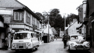 High Street, Poriock, Somerset, 1960 A 1950s’ Austin J2 minibus, which has seen better days in spite of not being very old, stops for petrol in the years when it was not unusual for garages to be sited among regular shops. This RAC affiliated garage offers a range of services, including VIP petrol, and BMC Morris sales. Once you had filled up, you could always pop next door to Leach’s Dairy Guest House cafe for a cuppa, and buy your Bristol tipped cigarettes at the same time. The Standard Vanguard parked outside W. S. Prosser’s on the opposite side of the road -perilously close to a bus stop -looks in much better condition.