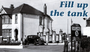 A smart 1930s’ Austin 10 pulls up in front of a typical house of the period in Wales, but Gwynn’s was the service station in its garden. With Shell Mex at l/5d, it was a good spot to fill your tank, when the average price per gallon for 1937 was l/7d. Other brands on sale included Power (at 1 /51/2d per gallon) and BP Ethyl. The garage is still there, and is now called Pontiiiw Service Station.