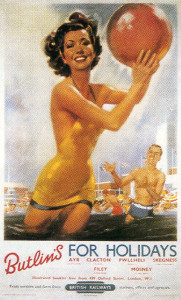 Along the sea front ran the ancient charabancs with their bench seats stretching the width of the vehicles. It cost a penny to ride from the Clock Tower all the way to Uncle Arthur’s, the amusement park opposite the Derbyshire Miners’ Home at the north end of the sands. We didn’t think Uncle Arthur’s was a patch on Butlin’s bigger, brighter amusement park back down the beach, seaward of the Clock Tower. Butlin’s Big Dipper was higher, faster and noisier than Uncle Arthur’s and day and night a clown, in coloured lights, bounced a ball, also in lights, across the front of the park.